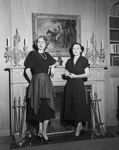 Mrs. A. P. Fuller, left, and Mrs. J. Stuart Lydick, right, can be seen standing in front of a fireplace. The two women are both members of the local women's committee for the Texas Bankers Association meeting.