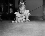 Terry Nifnecker, who is visiting her grandparents, Mr. and Mrs. Lloyd C. Jordan, with her mother, Mrs. L. David Nifnecker, examines a replica of the coronation coach brought to Terry from England by a friend.