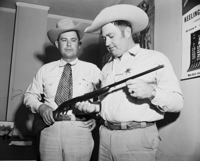 Constable Woody Sullivan, left, and Hockley County Sheriff Wier Clem examine the 22-caliber rifle used in the slaying of Richard McChristial at Sundown. Jack Killingsworth of Sundown is on trial in Levelland's 72nd District Court for McChristial's murder.