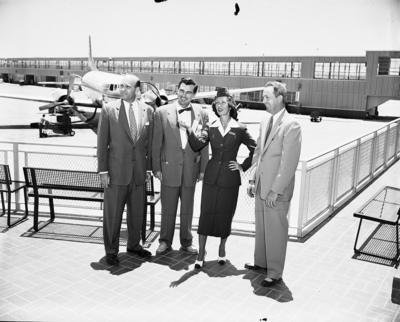 Mrs. Ruth Babson, terminal supervisor of hostesses at Amon Carter Field realty dealers on a tour of the airport. Presidents of the Fort Worth, Dallas and Arlington Real Estate Boards, shown with Mrs. Babson, are left to right, Henry Miller Jr. of Dallas, J. C. Llewellyn, Fort Worth, and J. R. Bowden, Arlington.