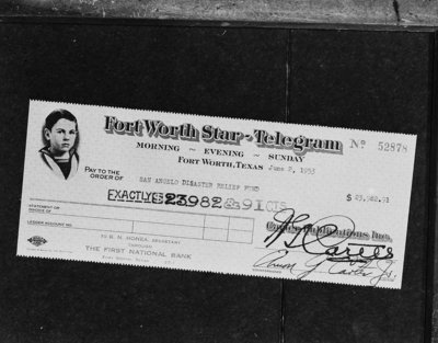 This is a check for $23,982.91 turned over to the San Angelo Disaster Relief Committee by Amon Carter Jr. The money was raised by donations of readers of the Star-Telegram.