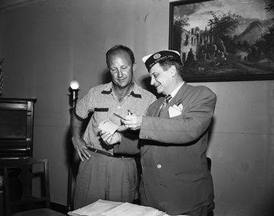 Clyde Thomas, right, president of the American Legion junior baseball program, shows contributions that will help finance the league to Johnny Stovall, who'll coach the Arlington Heights team this summer.