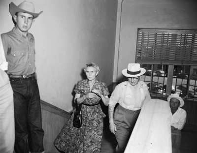 Series on Jack Kilingsworth trial at Levelland. Mr. and Mrs. W. J. Killingsworth of Seminole,Oklahoma, parents of Killingsworth, who is on trial in Levelland for murder, walk toward the courtroom.