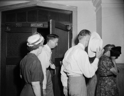 Series on Jack Kilingsworth trial at Levelland. Jack Killingsworth, center, former Sundown teacher, on trial for the murder of Richard McChristial, another faculty member, leaves Levelland district courtroom with his wife's parents, Mr. and Mrs. W. A. of Adamsville.