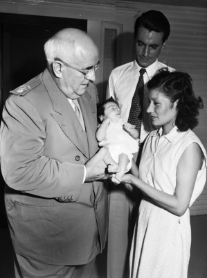 Mrs. Fermin Arriga, receives her infant daughter from Colonel John A. Black, left, executive director of Volunteers of America, in preparation for returning to her homeland. Mexican Vice Consul Javier Escobar Y Cordova of Dallas, center, looks on.