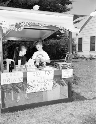 The thoughts of these children are with others needing their help as they opened a soft drink stand at 604 Oakland Thursday. Janice Pearce, 8, and Terrell Gass, 9, were busy all day raising funds.