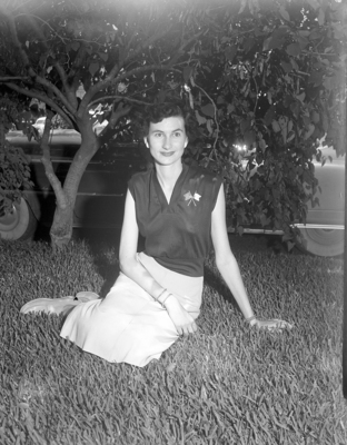 Miss Dorothy Perkins is shown seated outside on the grass, facing front and smiling..