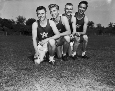Arlington Height's sprint relay team was favored to win in city track meet and possibly break mark of 44.6 seconds. Left to right, Robert Nation, Bill Huff, Ronald Clinkscale, and Robert Carson. Published in the Fort Worth Star-Telegram evening edition, April 26, 1950.