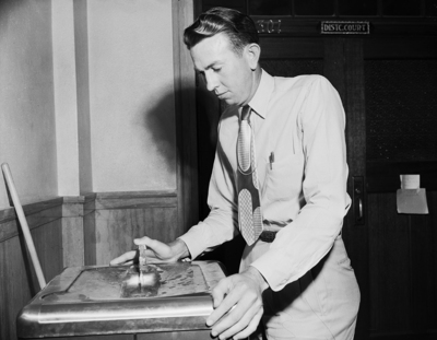 Jack Killingsworth in the "Dance of Death" slaying of Richard McChristial, a fellow teacher at Sundown High School, gets a drink in the courthouse corridor during a recess.