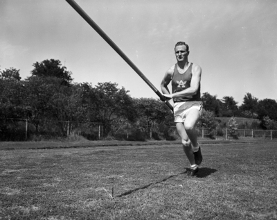 Ken Harlow of Arlington Heights sought the city high school pole vault title in competition. Published in the Fort Worth Star-Telegram morning edition, April 27, 1950.