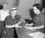 Mrs. Mattie L. Swann, left, cast the first absentee ballot for a June 27 personal property tax election with her is Mrs. Katie Green.