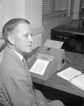 O. S. Causey, TCU professor of education shown with rate controller machine.
