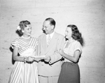 Zillah Mae Turman, left, president of Musagetes, gives a $1,000 check for Cook Memorial Hospital for Children to Administrator Frank C. Gabriel. The money is the proceedings of the Musagetes annual follies. Mrs. Billy Muth producer of the follies is at right.