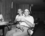 Golfers Ronnie Honeycutt (left) and Reub Berry, cooling off in the Glen Garden Country Club clubhouse, both holding a beverage. Berry will defend his senior championship in the city golf tournament opening at Glen Garden. Clipping reads: "For a birdie putt, a stray eagle."