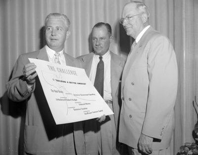 Review of National Association of Manufactures objectives was given by Dan L. Grant, left, of Houston, for M. J. Neeley, right, and George W. Armstrong Jr., and other Fort Worth business and industrial executives Tuesday at Hotel Texas.