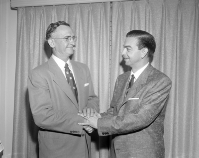 Bob Cooke, left who was honored Tuesday night as Arlington's outstanding citizen for 1952, is congratulated by Mayor Tommy Vandergriff, recipient of a similar award a year ago, at the annual meeting of the Arlington Chamber of Commerce at Midway Inn.