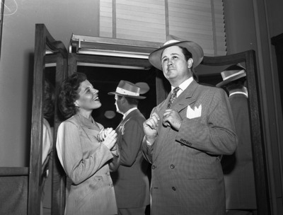 The admiration Mrs. Hassie P. Malone of 2329 Chandler bestows on C. R. Boden of 1615 Belmont and his new straw hat. Friday used to be Straw Hat Day for them. Mrs. Malone and Boden said any male can win similar approval with a new straw chapeau. They both worked for a store that sold hats.