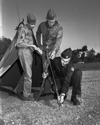 The audience at the Boy Scout Circus got a taste of Valley Forge when a typical National Jamboree camp was erected. Pitching their new pale green tent are Henry Layton of troop 20, front, and Jerry Reynolds, also of 20, and Orby West, neighborhood commissioner of the North Star District, back, left to right.