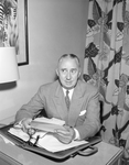 Dr. Ralph W. Sockman, a Methodist speaker is shown seated at a desk.