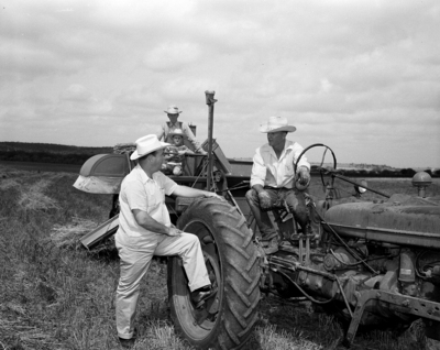 Oat production on the Billy Miller farm in Somervell County is discussed by County Agent Doyle Cooper, left, and Miller. On the combine are Lowell Lane and Billy Miller Jr.