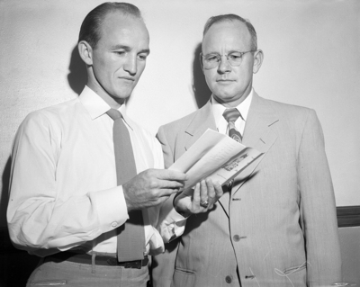 Shown here standing and reading a leaflet are Reverend Jim Flynn of Waco, left, and R. K. Green of Santa Anna. They are attending the Methodist conference.