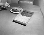 Pecan Cake in pan with slices served on a plate. Published in the Fort Worth morning edition, May 7, 1950.