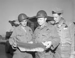 The three men from left to right, are Sergeant First Class (Sgt. 1/C) E. L. Fleming, Major (Maj.) Buford McCauley, and Master Sergeant (Sgt.) H. F. Kearns. They are shown checking on the map the route they will take to camp.