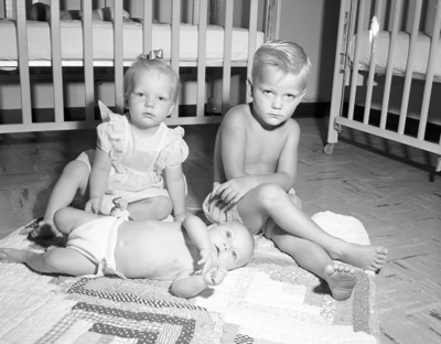 Authorities took these three children out of custody of their mother, Mrs. O. Z. Lemens, after finding Rebecca, 4 months old, in front, and Ronnie, 2 year old girl, on left, locked for six hours in their home together with their brother, O. Z. Lemens Jr., 4, on right. They will live with grandparents in Glen Rose.