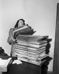 Mrs. D. B. Jones, a payroll clerk, inside the United States Census Office in Fort Worth. Mrs. Jones can be seen hoisting a stack of completed census forms onto a growing pile that sits on her desk. Published in the evening edition, April 26, 1950.