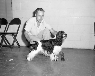 This black and white particolor cocker spaniel was picked as best puppy in the Lone Star Cocker Club's sanction match Sunday. The dog, Blan-Ton's Cimeron, was shown by his owner, Cecil Blanton.