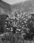 Mrs. Ernest Reed is shown standing next a transplanted Snowball tree, also known as a Guelder-rose, a plant native to Europe, northern Africa and central Asia. Other plants and a building are visible in the background. Published in the morning edition, April 30, 1950.