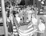 Members of the Daughters of the American Revolution, Sons of the American Revolution and the Girl Scouts pay tribute to the American flag during Flag Day ceremonies. Girl Scouts raising the Stars and Stripes are, from left to right, Janice Blair, Lanora Roper, Alyce Mays, and Elayne Roper of Troop 67.