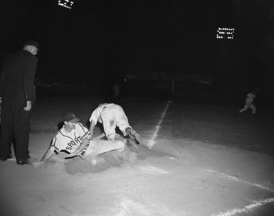 Shreveport's Les Layton upends Cat Catcher Ken Staples while slid-home with run in the first inning at La Grave Field Tuesday night.