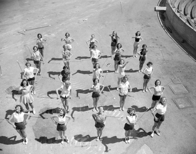 Twenty five of the 300 twirling students from four states go through their paces on the TCU campus. Woody Woodward, former national twirling champion, is instrucing the sixth summer high school class in connection with the university's Fine Arts Clinic.