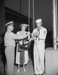 Mrs. H. C. Vandervoot, retiring state president of the Daughters of the Republic of Texas, presents a Texas flag to Commander (Cmdr.) J. R. McGonigle, left, commandant of the U.S. Naval and Marine Corps Reserve Training Center here. I. A. Blazie, right, lab technician third class, looks on.
