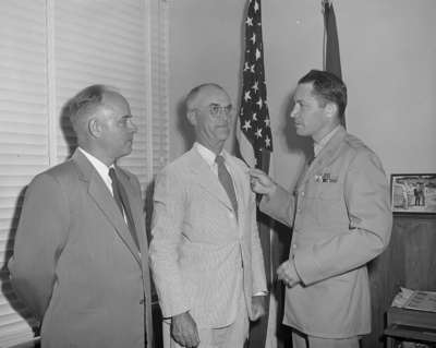 Colonel (Col.) H. R. Hallock pins a 20 year service pin on Fred W. Johnson, deputy chief of construction for the Fort Worth District, U. S. Corps of Engineers. At center is another 20 year pin winner, France K. Mixon, engineer who handles preliminary planning work on recreational facilities.