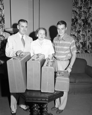 Reverend (Rev.) G. Alfred Brown, former superintendent of the Fort Worth Methodist District, surveys a gift of suitcases received at a farewell party. Mrs. Brown and his son, G. Alfred Brown Jr. share in the gift. Reverend (Rev.) Brown will become a pastor of Austin Methodist church in Waco, Texas.