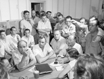 Members of the Haltom City Council listened to the voters as a large delegation showed up to protest lack of water. Seated, right, at head of table is Mayor Virgil Goodman. Council members, left to right, are J. Q. Scribner, T. E. Bachner, and Odis D. Stewart. Standing at extreme right, E. G. Boyles has his say on the matter of the current water shortage.