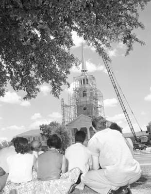 A giant crane hoists the 44 foot steeple to its position atop the Texas Christian University (TCU) Religious Center as summer school students watch.