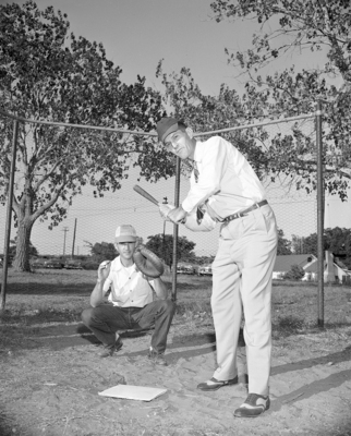 Fort Worth Police Chief Cato Hightower sights confidently along the course the ball is going to pursue while Harry L. Vann, a new officer with two weeks experience behind him, just as confidently prepares to catch it during the police picnic.