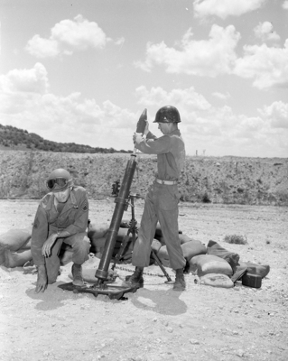 Sergeant Charles H. Watters Jr. of Fort Worth, left, and Sergeant Benny L. Briscoe of Cleburne are firing an 80mm mortar.