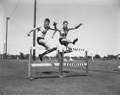 Val Martin, left, and Toppy Ponder give North Side twin high hurdles threats in city track meet at Farrington Field. Published in the Fort Worth Star-Telegram morning edition, April 26, 1950.
