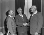 Dr. Phil R. Russell, center, of Fort Worth, executive secretary of the Texas Osteopathic Association, welcomes Dr. Earl Mann of Amarillo, right to trustees' meeting at the state convention at Hotel Texas. At left is another trustee, Dr. Merle Griffin of Corpus Christi. Dr. Phil R. Russell is shaking hands with Dr. Earl Mann.