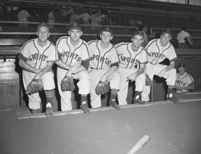 Shreveport's pitching staff includes, left to right, Doyle Lade, Dave Cyrus, Hugh Sooter, Bill Tremel and Joe Piercy. Lade will face Cats in series opener here tonight.