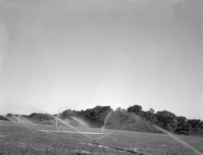 L. P. Reed's newly developed sprinkler irrigation system is shown at work on a field of alfalfa.