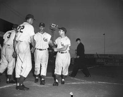 Three home-run hitting Cats, Danny Ozark, left, and Vic Marasco, right, welcome Jim Baxes after game-winning blow. Cats won over Buffaloes.
