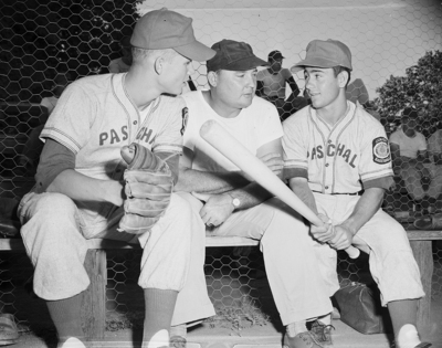 Manager Durward Horner, center, of unbeaten Coca-Cola team discusses American Legion baseball race with his star pitcher, Jimmy Bronstad, left, and Second Baseman Harry (Bubba) Andrews of Paschal.