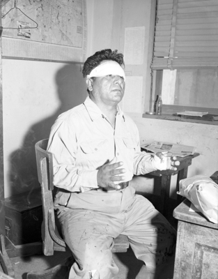 Absalom Paul Jefferson, uses his lacerated hands to describe the fireworks plant blast which wrecked his home and almost scalped him. The injured man, a Choctaw Indian, was busy with his midday reading of the Bible when the plant exploded.