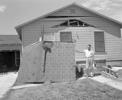 Berry Atwood of 5218 Terrace Trail, examines a portion of his house that was blown off in the blast.