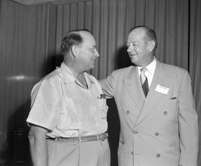 H. L. Eversberg, left, Shell Oil Company, Baton Rouge, La., discusses past conventions with William E. Bates, from the Texas Company, Midland during the National oil and Landsmen's Association at Hotel Texas.